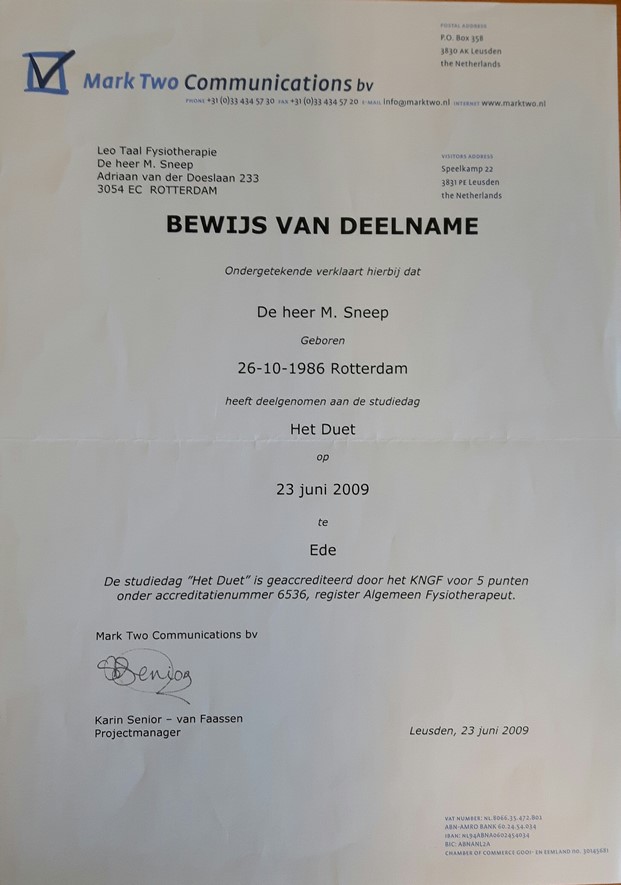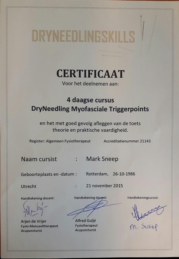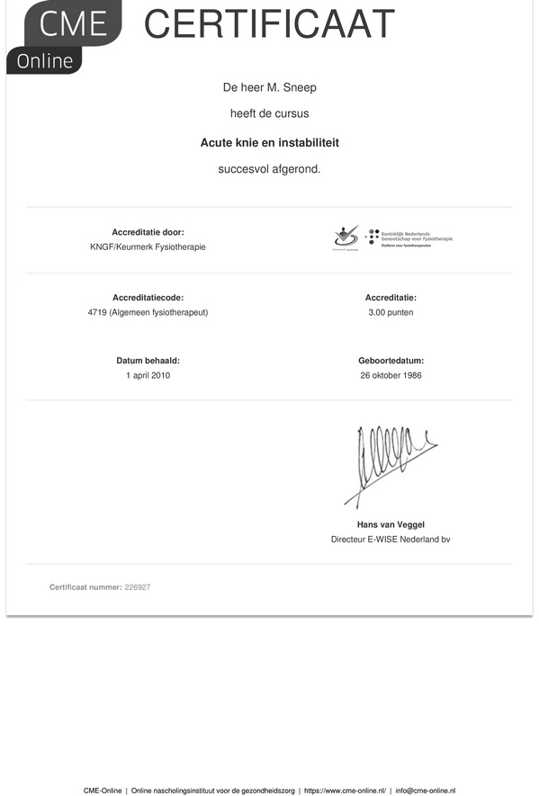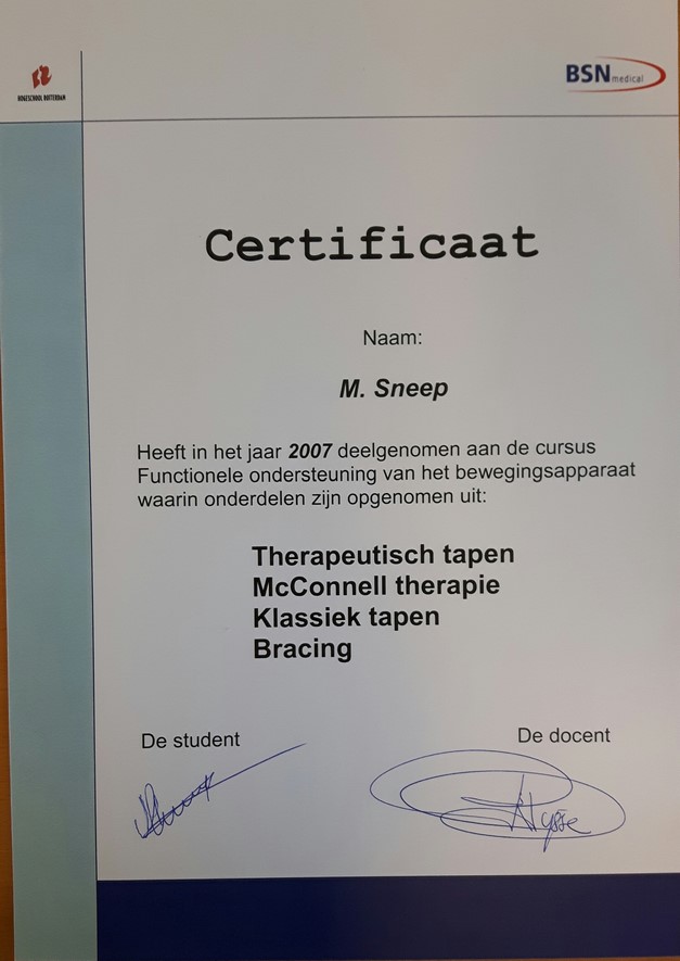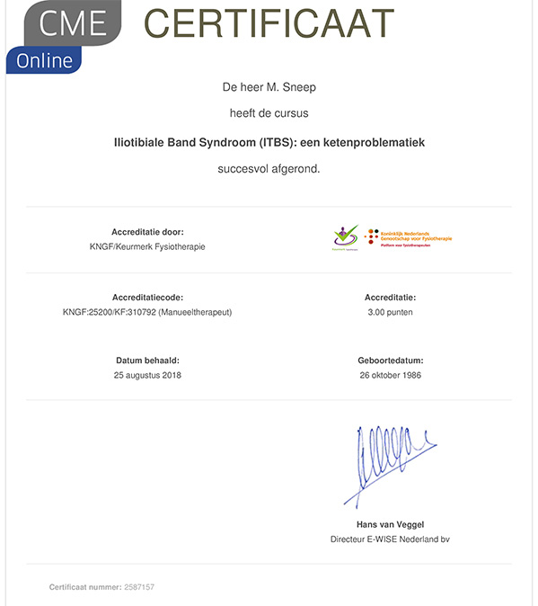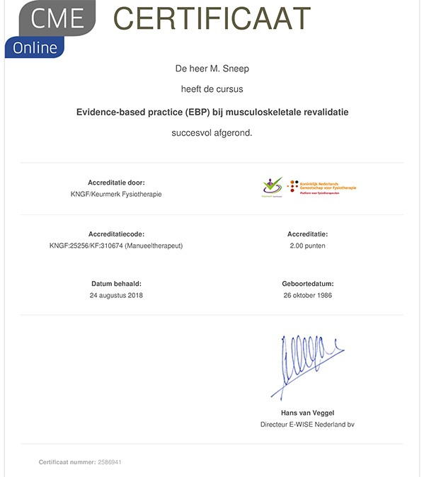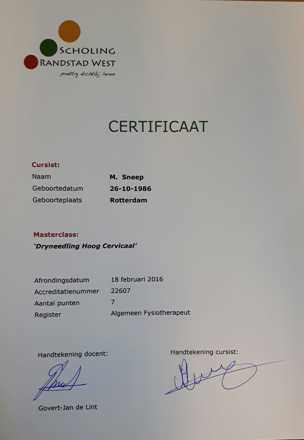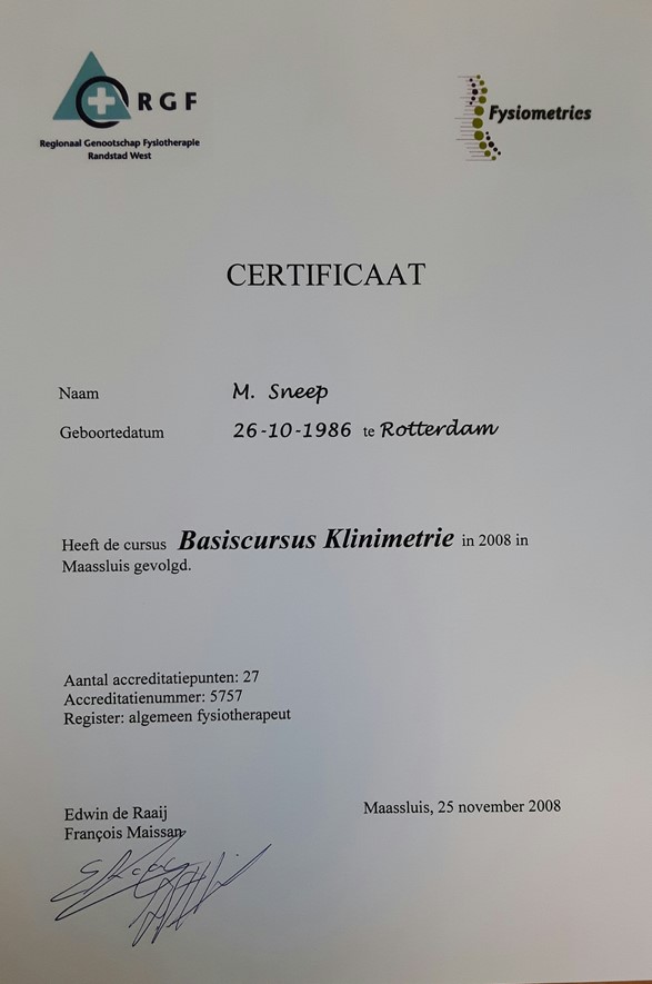 Hieronder vindt u een lijst met de door mij gevolgde cursussen. Door deze cursussen te volgen kan ik ingeschreven staan in het KRF NL van het KNGF. Klik op de naam van de cursus om het certificaat te bekijken.