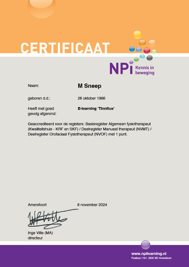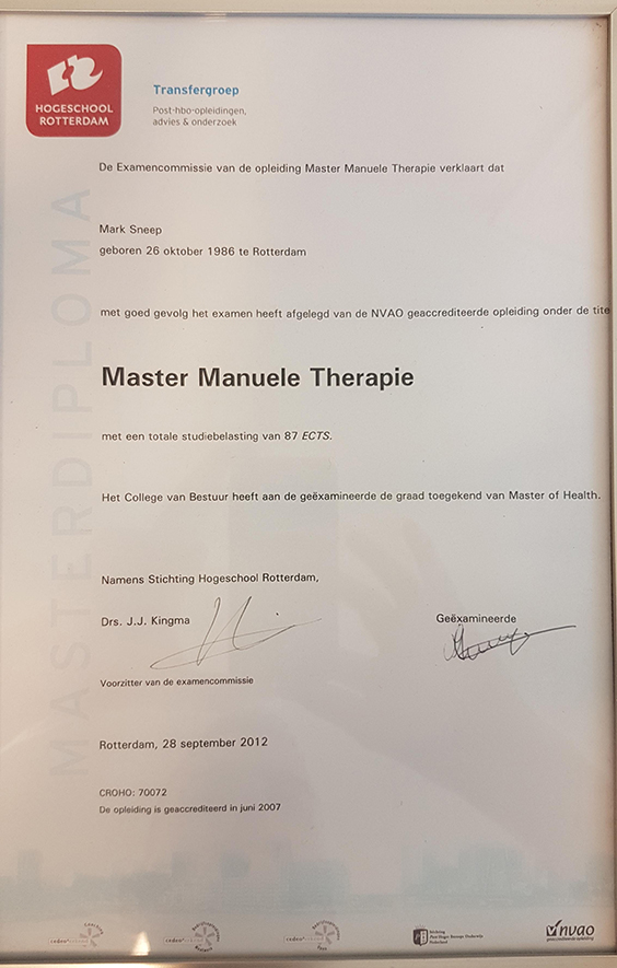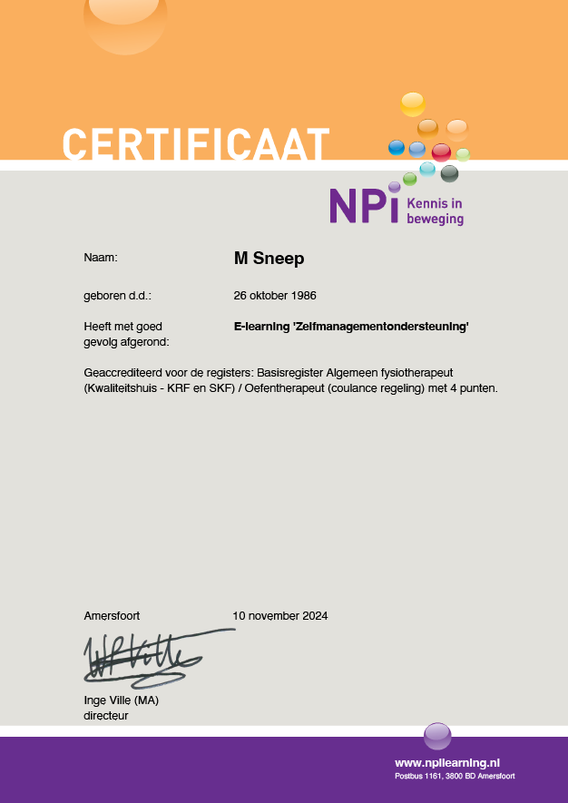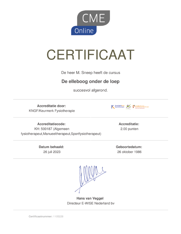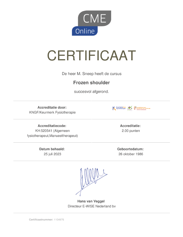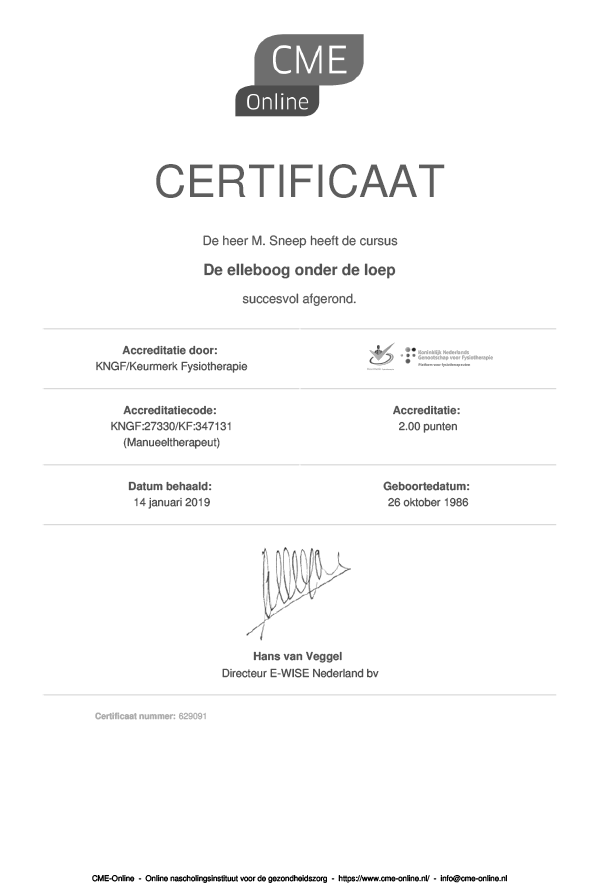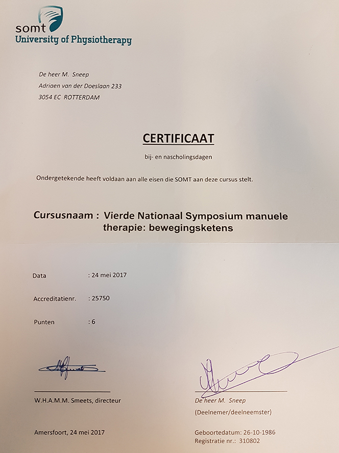 Hieronder vindt u een lijst met de door mij gevolgde cursussen. Door deze cursussen te volgen kan ik ingeschreven staan in het KRF NL van het KNGF. Klik op de naam van de cursus om het certificaat te bekijken.