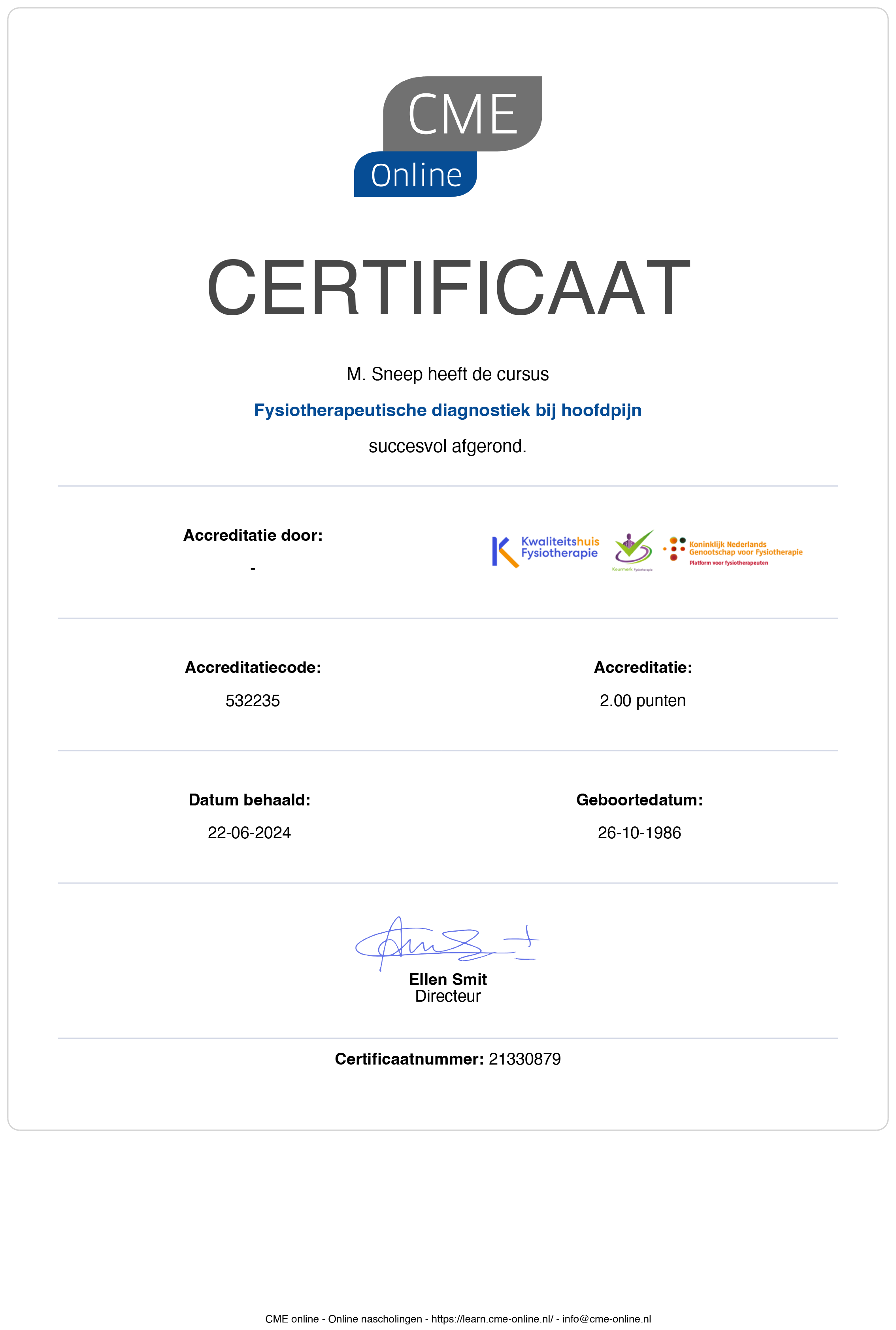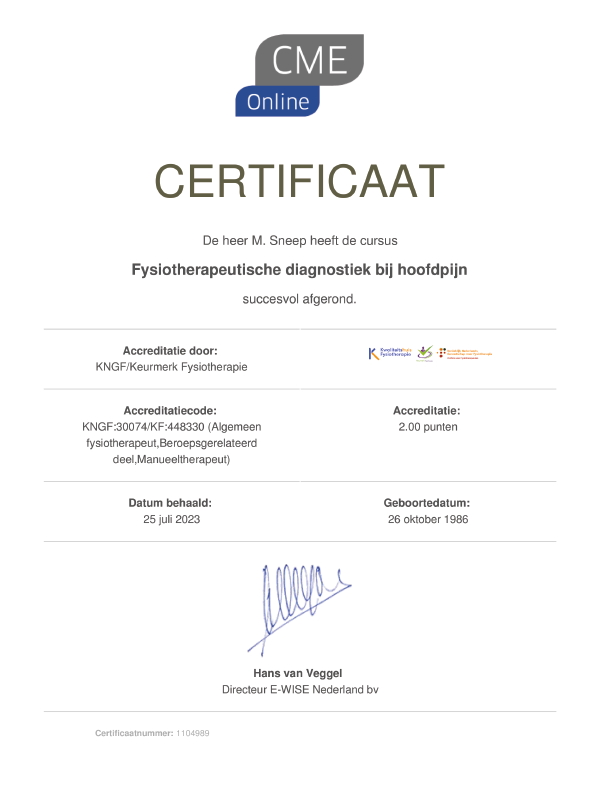 - Theoriecursus: Fysiotherapeutische diagnostiek bij hoofdpijn;