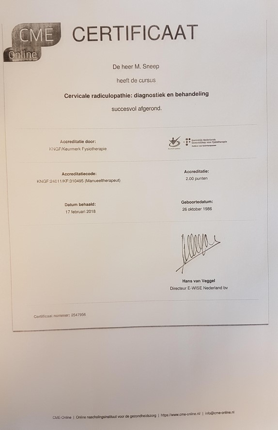 - Theoriecursus: Cervicale radiculopathie: diagnostiek en behandeling;