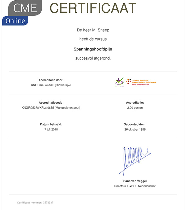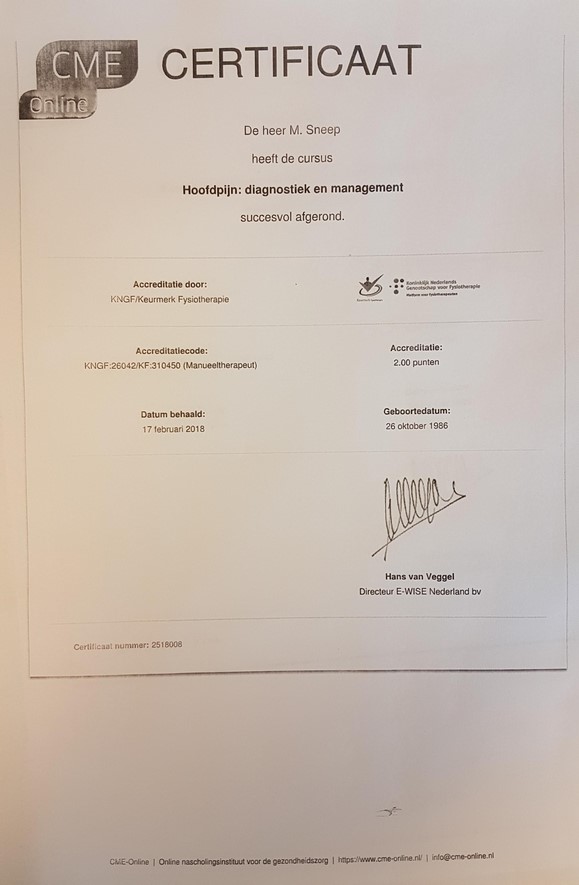 - Theoriecursus: Fysiotherapeutische therapie bij hoofdpijn;