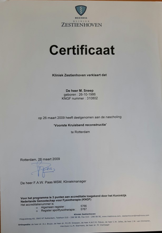 - Voorste kruisband reconstructie, kliniek Zestienhoven;