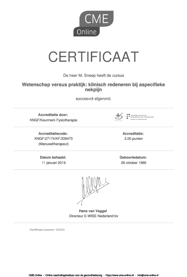 - Theoriecursus: Wetenschap versus praktijk: klinisch redeneren bij aspecifieke nekpijn;